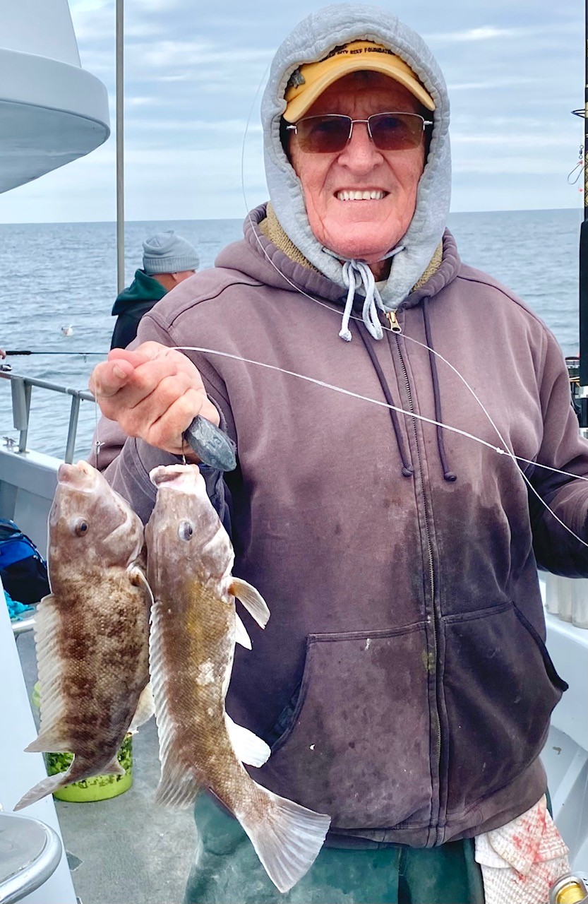 Had anticipated somewhat boisterous conditions heading off this morning – they were. Sean C dropped blocks at Greg Hall’s Memorial Reef. I laid inshore for our toggin trip. Fish bit well save a lull when current switched NNE to SSW. Brought a fair jag of whites and green crab for bait; used dern near all of em too – like really all – and in an hour late cause the bite was on..