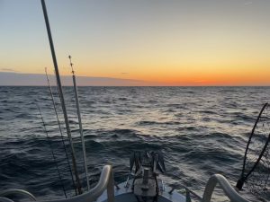 Weatherman played his funny game today. All week and yesterday evening? Forecast called for less than 10 knots ENE – said: “Capt! You gotta go fishing!”