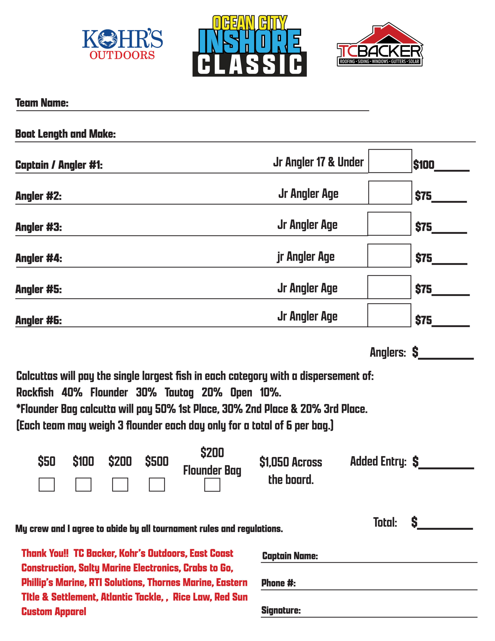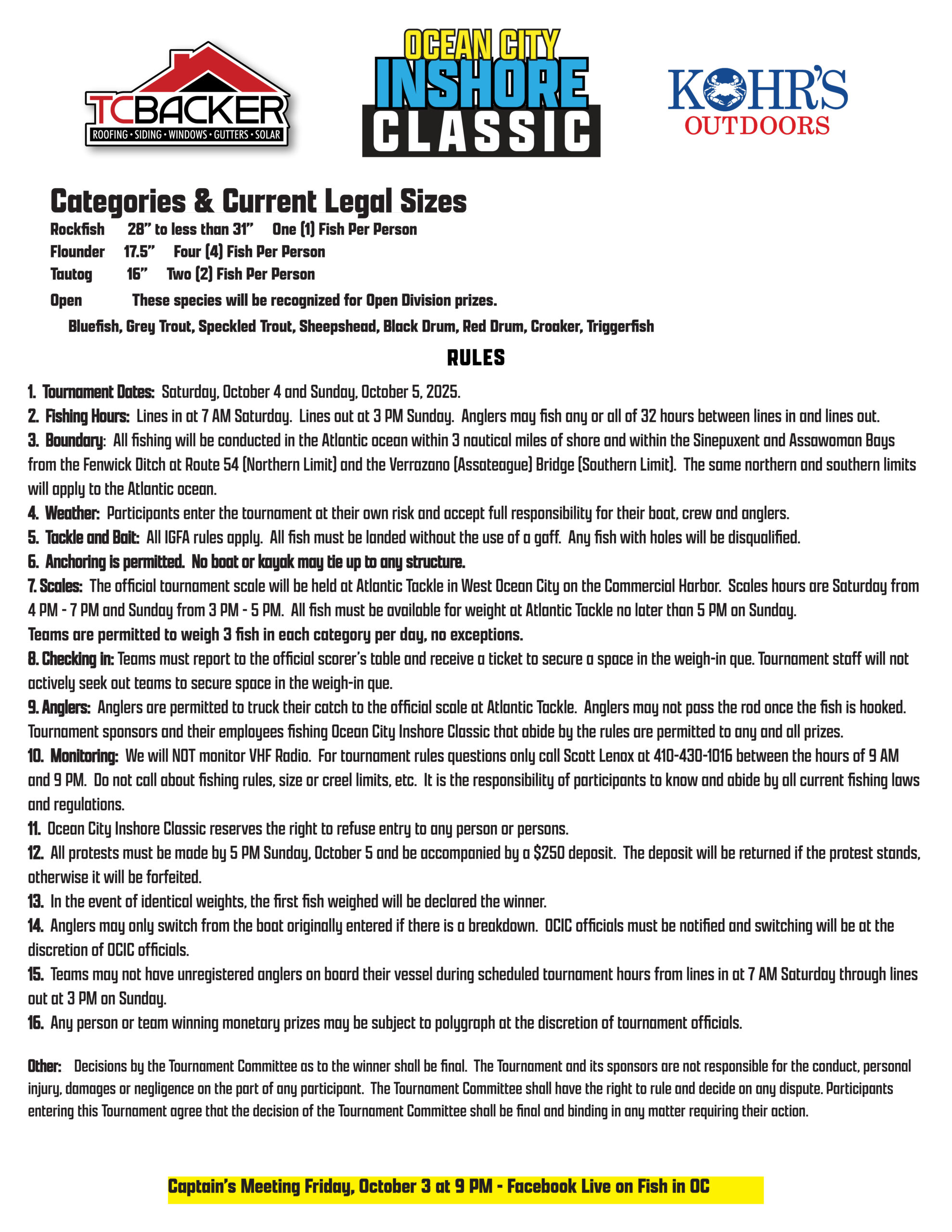 The Ocean City Inshore Classic is a 32 hour inshore fishing tournament with categories for Rockfish, Flounder, Tautog and Open. $100 registration per boat includes Captain. $50 each for each additional angler up to 5. 1st, 2nd and 3rd Place prizes will be paid in all four categories $50, $100, $200, and $500 calcuttas will be paid to the largest fish in each category. There will also be a $200 heaviest flounder bag Calcutta available. Open Division will recognize the following fish only: Bluefish, Grey Trout, Speckled Trout, Sheepshead, Black Drum, Red Drum, Triggerfish and Croaker.