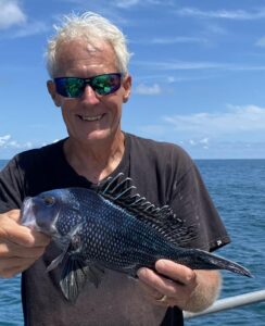 A sure sign high summer nears: my first inshore flying fish of ’23 flew from beneath the bow on our way off. Seems a marvel of nature that a fish can fly. Water’s been warm enough some while, yet we’ve had no indication of blue water or blue water life – just happy algae in warm green water.