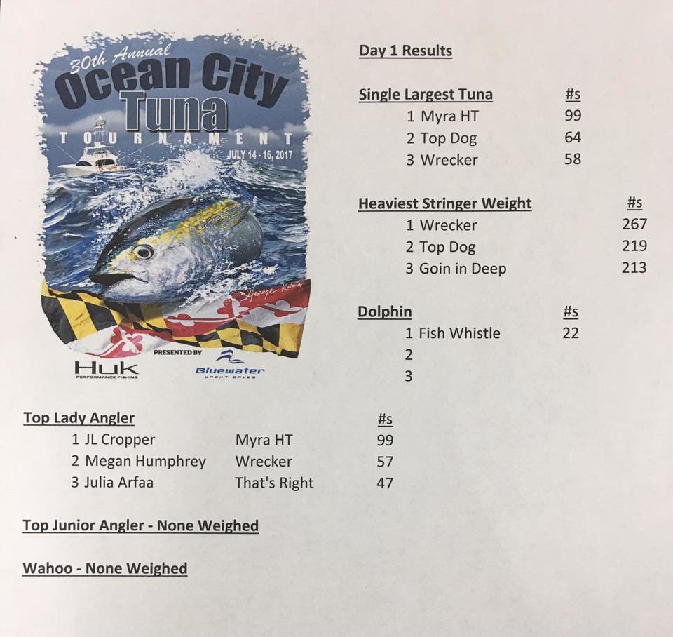 Here are the rest of the standings after one day of fishing for the 30th Annual Ocean City Tuna Tournament.