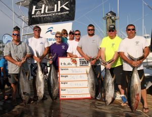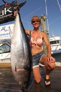 Captain Jeremy Blunt of the Wrecker had the best day of all those fishing the first day of the OCTT. Captain Jeremy put his crew on six healthy yellowfin tuna and currently resides in first place in the biggest stringer category. You’re only allowed five fish per day for your stringer so Captain Jeremy even had to bounce their smallest fish out. Even after bouncing one they still had 267 pounds of yellowfin and jumped into first place. They also hold third place in the biggest fish category with a 58 pound yellowfin and second place in the lady angler category with a 57 pound yellowfin. That’s a nice day of fishing.