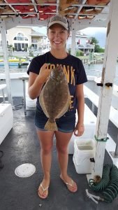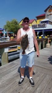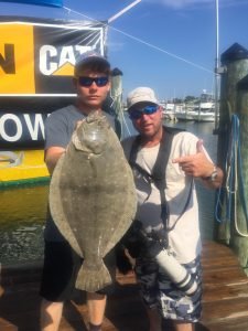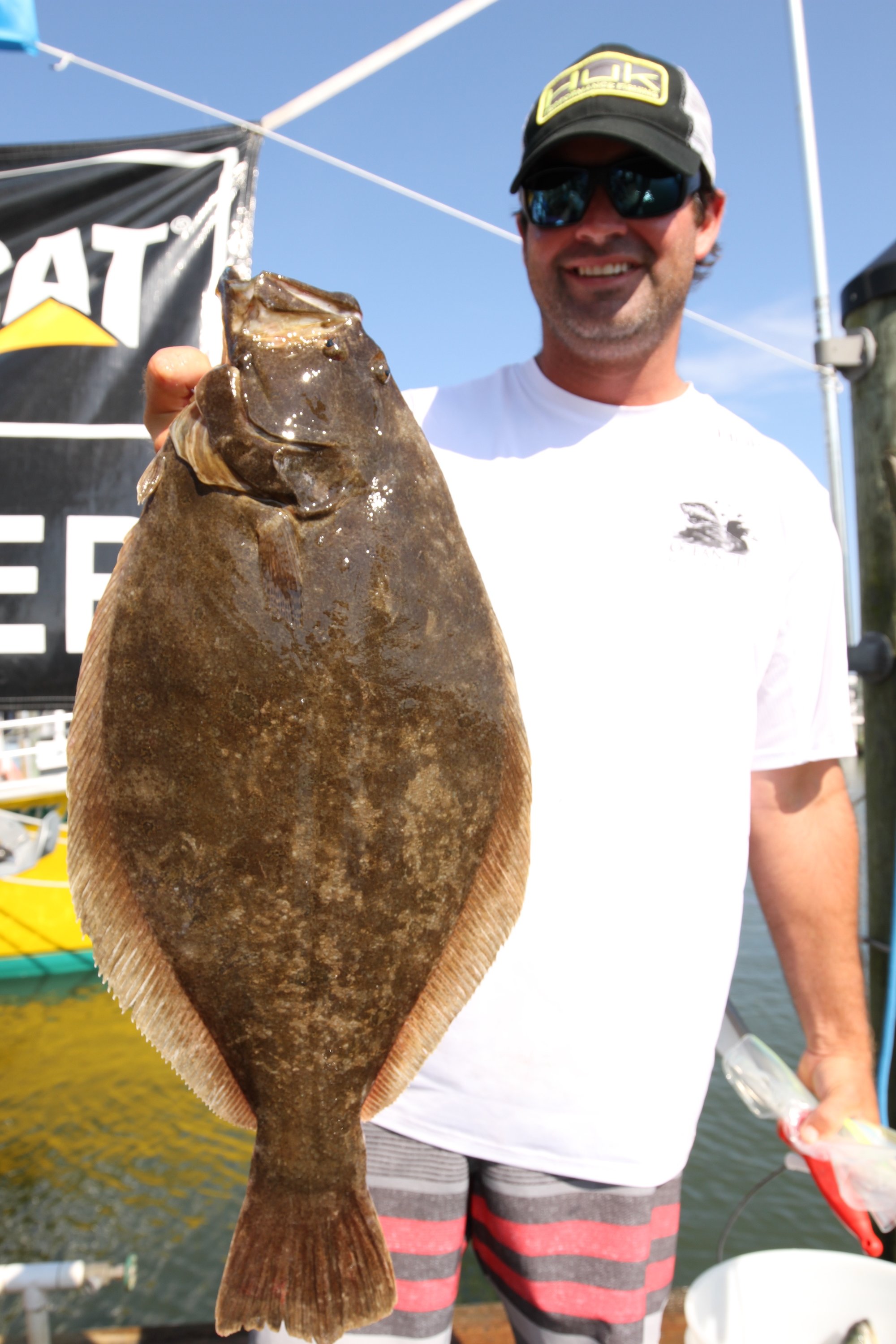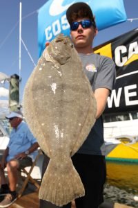 The next big flounder rolled in right behind Captain John’s fish and was brought in by Joey Marowski who is mate on the Bay Bee. Captain Cale Layton gave Joey one last drop and he was able to produce this 22.5″, 4.7 pound flounder on a big shiner. Hooked on OC cameraman Dave Messick was stunned by the big flattie. Big thanks to Dave for some of tonight’s photos from the scales.