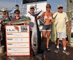 First place in the big fish category is also the first place lady angler fish and a beauty of a bluefin tuna. JL Cropper caught this 99 pound bluefin on board her husband Hugh’s Myra HT and they also weighed a mahi that didn’t meet the 20 pound minimum.