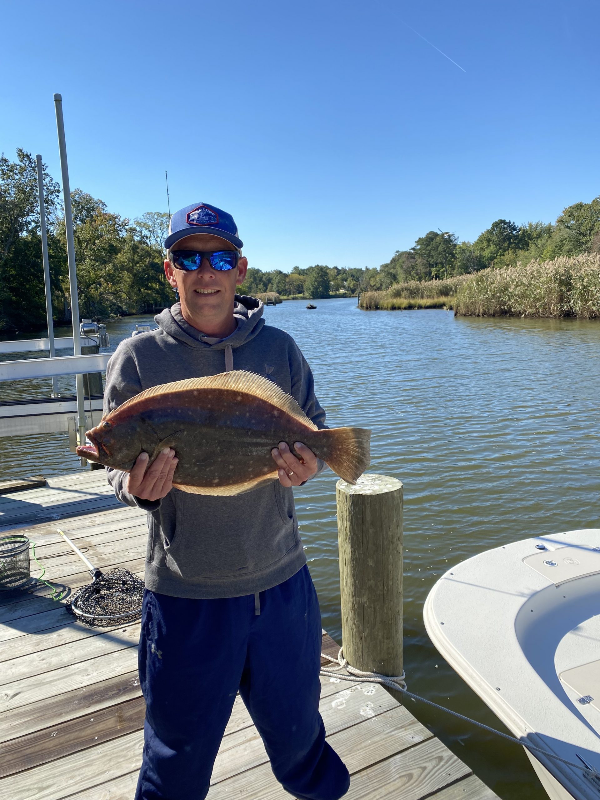 It was an absolutely beautiful fall day today with sunny skies and temps in the mid 70s in and around Ocean City. The wind blew up pretty good out of the south this afternoon roughing up the ocean a bit and making bay drifting pretty tough, but there were still plenty of fish caught on what was an awesome day on the water. Kristen and I even got out to take advantage of the awesome conditions and we put three nice keeper flounder in the box and released a bunch more using the Fish in OC Deadly Double and Live Bait Rigs.