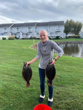 Lonna Axe caught these keeper flounder of 19.25″ and 19.5″ north of the route 50 bridge while fishing with her husband Tim.