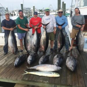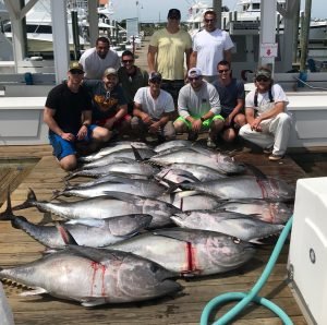 The first report that I’ve gotten from the boys on the Reel Chaos was today and it was a doozie!! The crew of Reel Chaos out of Sunset Marina with Captain Anthony Matarese Sr. at the helm fished the Wilmington canyon where they absolutely murdered the tuna. Captain Anthony put his crew on three healthy yellowfin tuna and 12….yes 12 bigeye tuna. The larges to the bigeye were just north of 100 pounds. Congratulations to Captain Anthony and the crew of Reel Chaos on an absolutely insane day of tuna fishing.