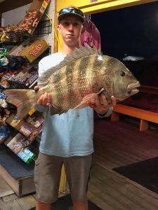 Bear down at the Oceanic Pier sent me a few more pics of Freddy and Jamie with a few more sharks from the surf and a stud of a sheepshead that Andrew Truitt caught on the sough jetty this afternoon. The big sheep ate a peeler and was 27″ and a whopping 15 pounds.