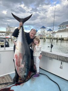 Captain Chase Eberle and his four year-old daughterAuburn Everleigh teamed up to catch this big 65 inch blue fin today.