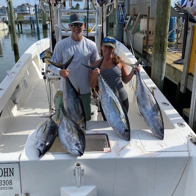 Captain John Prather of Ocean City Guide Service has a new 29′ Sea Vee and it is allowing him to run some offshore charters this year in addition to his usual inshore stuff. Today Captain John put his couple crew on five nice yellowfin tuna during an offshore trolling trip.