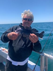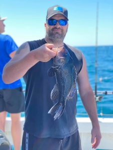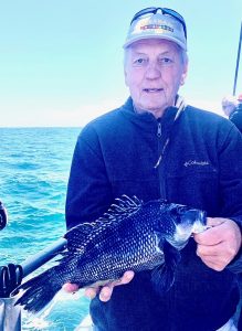 We found today’s sea bass bite less robust than yesterday. Grandpa Bill Keefer proved it could be done though, that an angler could limit out on sea bass even with a tepid bite. Bill was boxed out 45 min before we left for home. Never one to miss an opportunity to show off, Grandpa then caught a decent flounder. A pistol today, I wonder what he was like when he took a “tropical vacation” (his words!) aboard one of Uncle Sam’s patrol boats on the Mekong River, Vietnam.