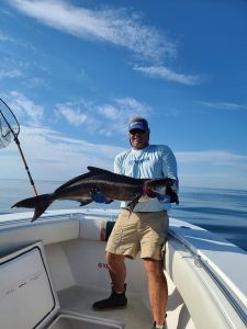 Captain Shannon Pickens, Joey Janda and Kyle Talerico had good flounder and sea bass fishing with a couple of bluefish right before they came across this 44″ cobia 5 miles south of the inlet that was enticed by a bucktail jig.