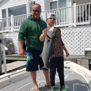 Reece Schindler was throwing a crank bait at the south jetty with Rich Daiker when he hooked into this bluefish that was estimated at around 11 pounds.