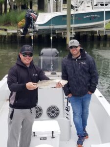 Chris Pino of Hook Optics Sunglasses was fishing with his brother Captain Anthony Pino when he caught this nice speckled trout behind Assateague on a popping cork.