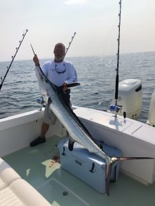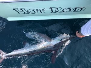 This morning Captain Steve Selander and Riley McCabe were fishing on the very first trip on Steve’s “Hot Rod” when they caught the first white marlin by a club member or boat while fishing in 64 degree water at the Hot Dog….yes 64 degrees at the Hot Dog. They caught some skippy tuna and were certain that they would catch bluefins, but were pleasantly surprised when they caught this white marlin at 10:30 this morning. The $5,000 fish ate a blue and white Ilander lure in front of a ballyhoo.