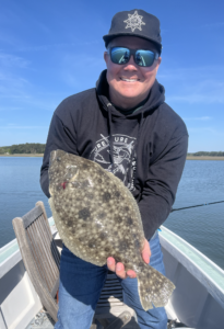 Bryan Mindte and I headed to Folly’s Creek today in his little boat the Junior Mint and had a great day of flounder fishing. Water wasn’t the cleanest, but we managed four nice keepers from 17″ to 19″ on Deadly Tackle Deadly Doubles. Orange was the hot color, but we also caught on chartreuse and white Deadly Doubles.