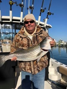 There aren’t a ton of rockfish being caught right now, but there are a few stragglers that have been captured as the water continues to cool down. Peter Renzi was fishing with angler Chuck Wenzel today on board the Fish Frenzi when Chuck landed this 35″ keeper rockfish. The guys were trolling white “Mojos” off of Fenwick Is.