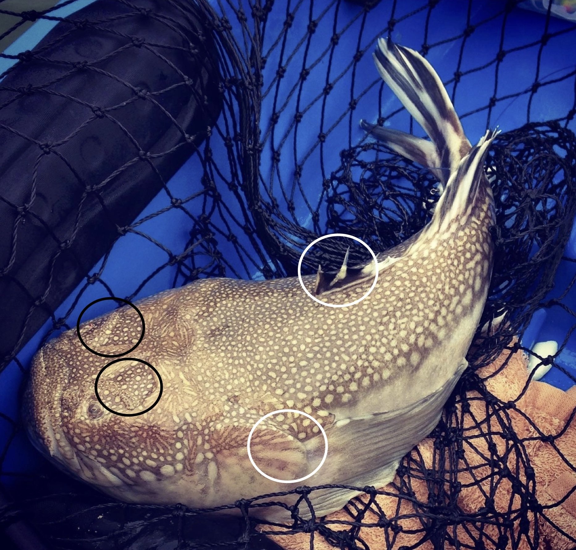 The stargazer. We don’t catch a lot of them in the back bays of Ocean City, but we do catch enough that I wanted to let you know a little about this bottom dweller. The stargazer is a muscular bottom feeder that buries itself in the sand to ambush unsuspecting baitfish a lot like a flounder. They also inhabit the same areas of the bay as flounder, hence the reason that we will catch them in Ocean City on minnows, mullet, small spot, Gulp and lots of other baits used for flounder fishing. There are two reasons to be really careful when handling a stargazer. 1. Stargazers are venomous. They have poisonous spines on the back behind their gill plate just above the pectoral fin. (White circles below) 2. Stargazers can pulse electric shock. Stargazers are one of only a few fish that are bioelectrogenic. Meaning that they can generate true electric impulses with their body. The spots to look out for on our stargazer are just behind the eyes on the top of the head. (Black circles below) Back in the late 90’s when I was a mate on the party boat Tortuga with Captain Dan Lampe we caught a stargazer and put this to the test. We put the positive and negative leads of our battery tester on the two spots on the back of the head. At first nothing, but when the fish shook it’s head and tail it pegged the needle on the volt meter. Needless to say, we didn’t touch it with bare hands, and you shouldn’t either. The best idea is to use a pair of pliers to remove the hook.