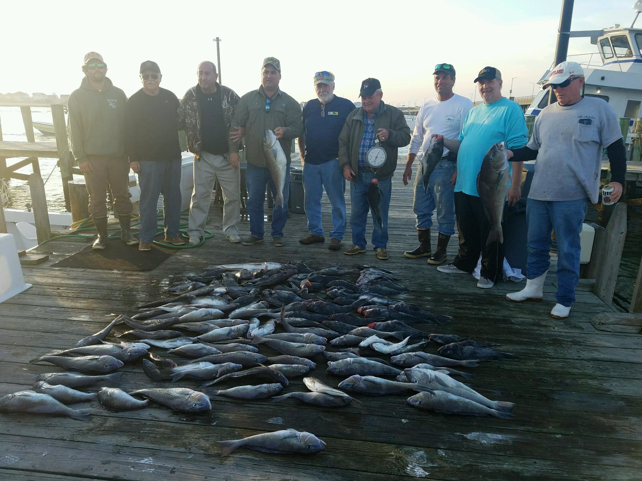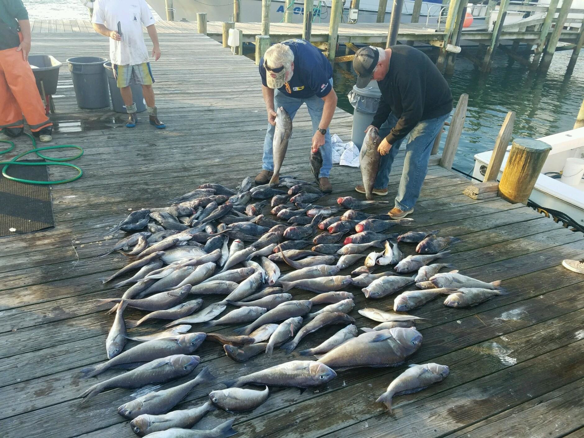 We had a charter boat off in the deep today, but they were focused on the fish that live on the bottom. The Jade II with Captain Ed Kauffman, Captain Dave Jacobs and Captain Jim Bunting had the crew of Lloyd Lewis, John Lewis, John Lewis Jr., Marvin Steen and Greg Steen out at the Rockpile for some bottom fishing and they slayed them. The crew combined for a huge pile of sea bass and blue line tilefish.