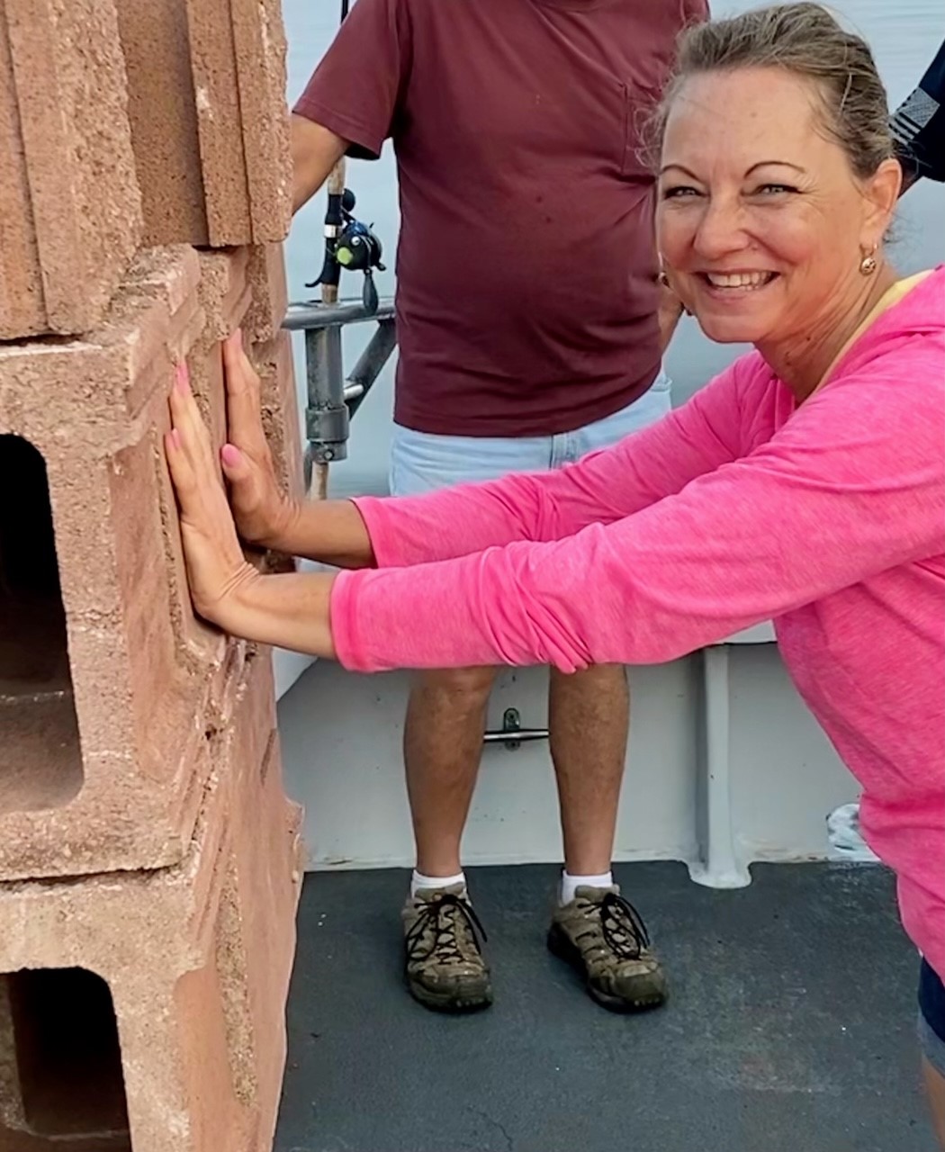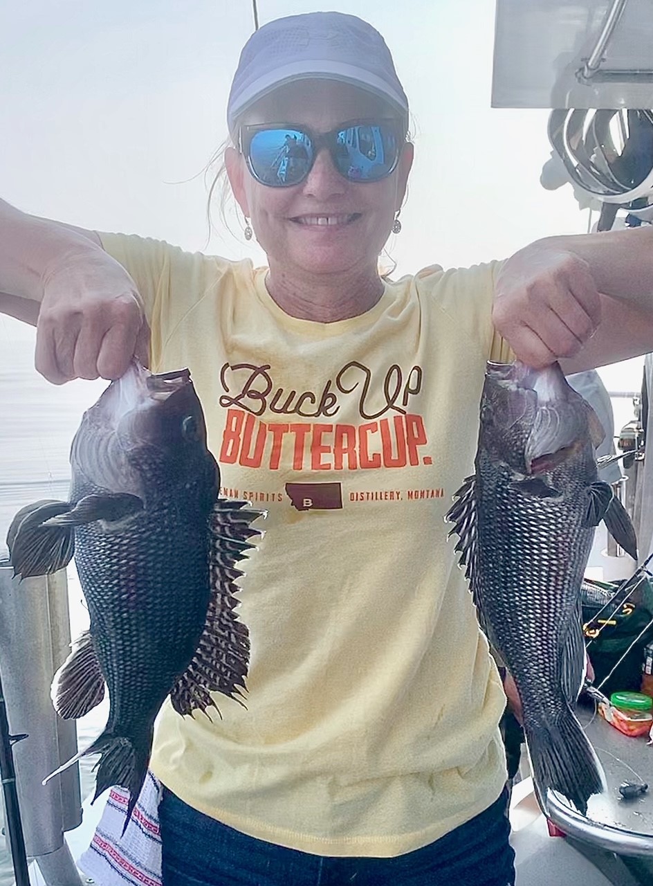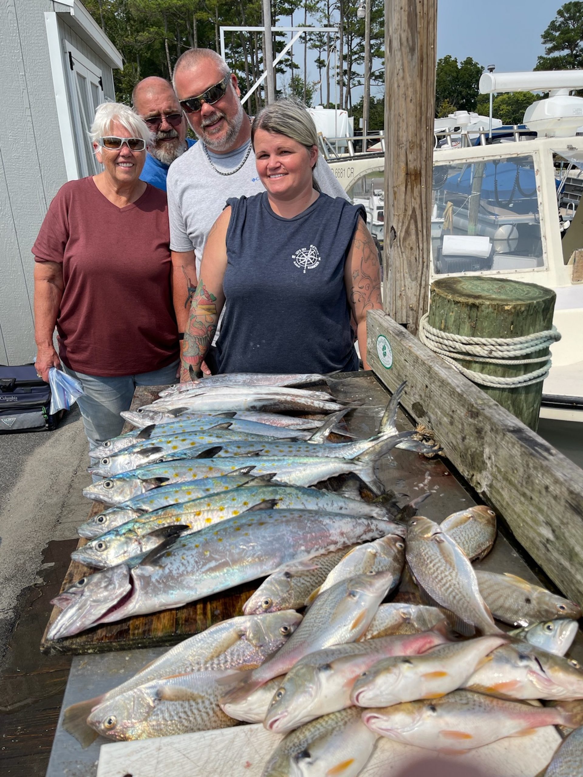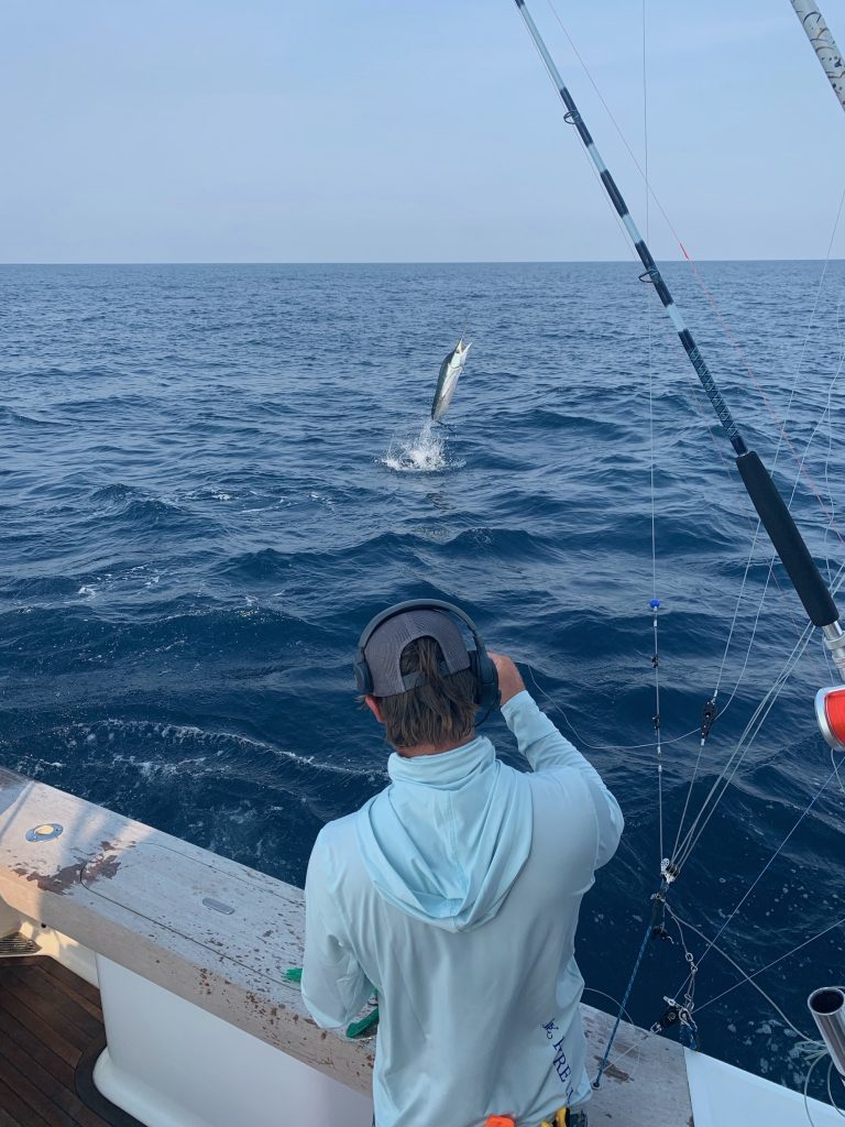 Had a bottlenose dolphin show with a super pod of 60+ animals at sun’s first showing, then found ourselves at a likely block drop site. Lynda from Mt. Airy MD did the deed and off we went.