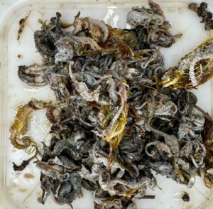 Trawlers call tube worm colonies ‘spaghetti mud.’ They can and do lose nets to a dense patch of tube worm. Here divers can recover their gear – that’s not always possible from a wreck.