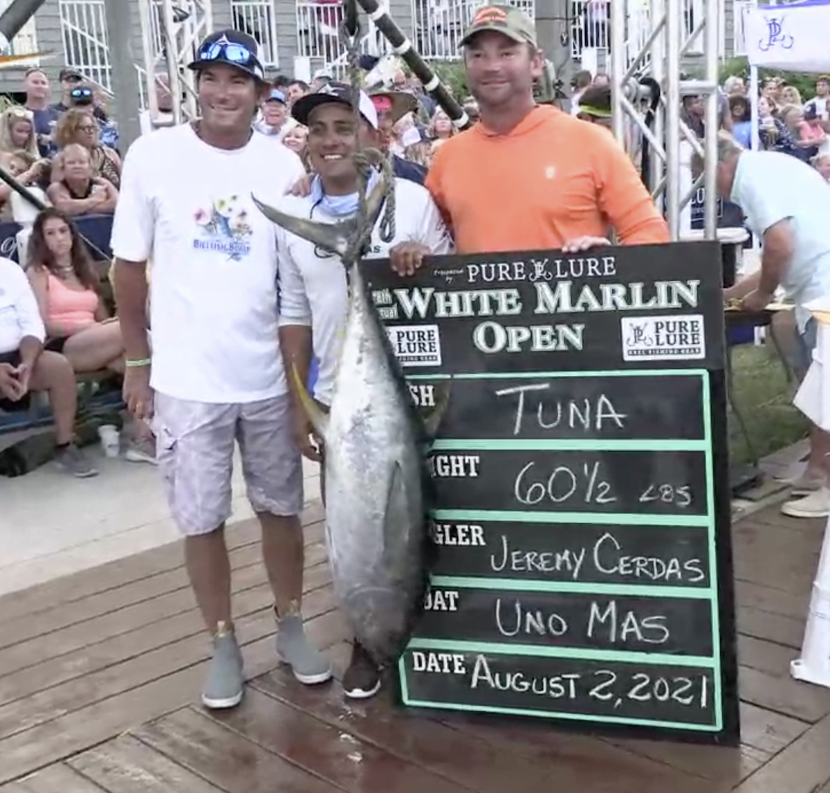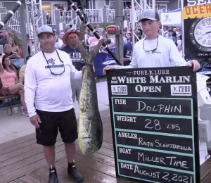 Day one at the record breaking 48th Annual White Marlin Open is in the books and as expected it was crazy busy. There weren’t any boats for the first part of the afternoon, but once they showed up it was non stop action. We saw shark, mahi, tons of tuna, blue marlin and white marlin hit the leaderboard on a day that saw 54 fish weighed which tied the record for the most fish weighed in a day during the event. The first fish was a beautiful white marlin caught by the Fender Bender that weighed 82.5 pounds and is currently worth $4.9 Million. We also got to see a big 559.5 pound blue marlin caught by the crew of the Mama C that wowed the crowd and is currently worth $800,000. It was an awesome day at the scales….here’s who’s winning what after one day of fishing.