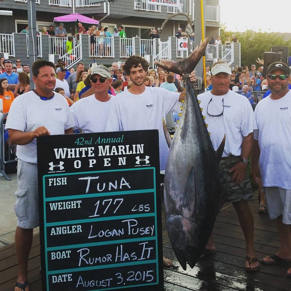 1st Place in the tuna category is held by a very happy but very nervous Logan Pusey who’s 177 pound bigeye caught on board the Rumor Has It is currently worth $425,000.