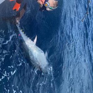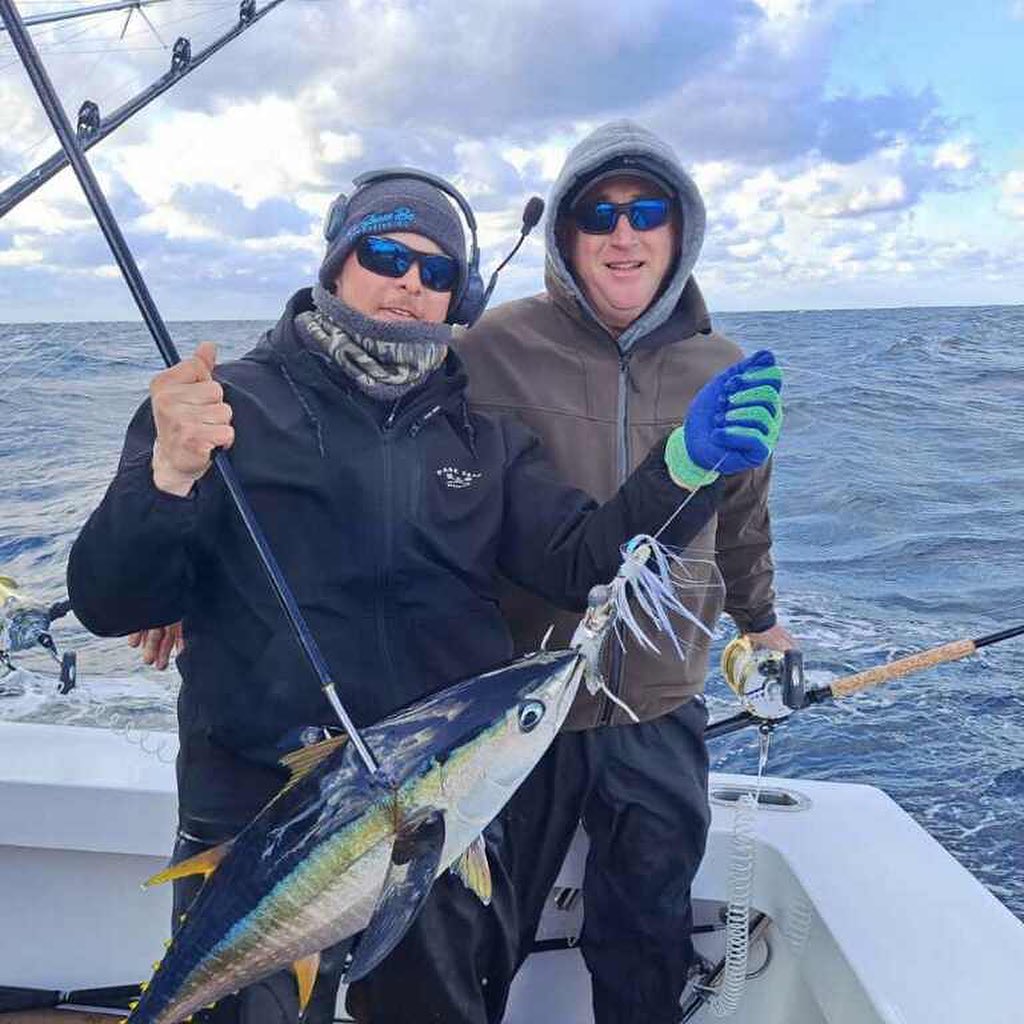 Captain Jeremy Blunt of the Wrecker and his family traveled to North Carolina and did some fishing with Captain Willie Zimmerman and the crew of RoShamBo in some rough ass sea conditions today. Seas were 10 to 12 feet, but RoShambo’s Seakeeper kept things manageable and helped the crew release a big 91″ bluefin tuna and box some football sized yellowfins.