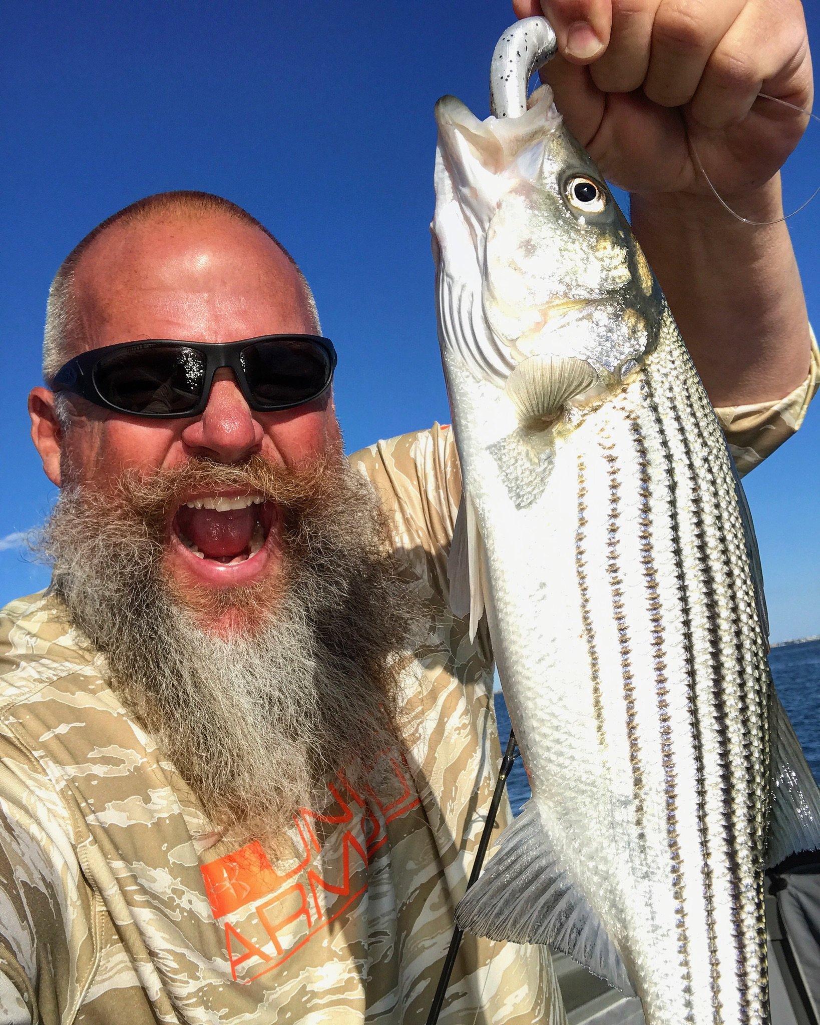 Captain Jeff Coats of Pitboss Fishing was moving the boat this afternoon and decided to make a few casts at the route 90 bridge. Captain Jeff used Big Bird’s Roy Rig to hook four small rockfish and lost one Roy Rig body to a hungry bluefish.
