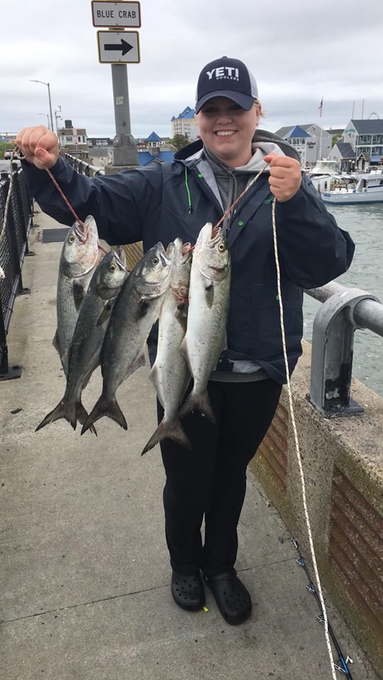 Nikki Uli fished the route 50 bridge in the sub par conditions today and caught a nice stringer of snapper sized bluefish.