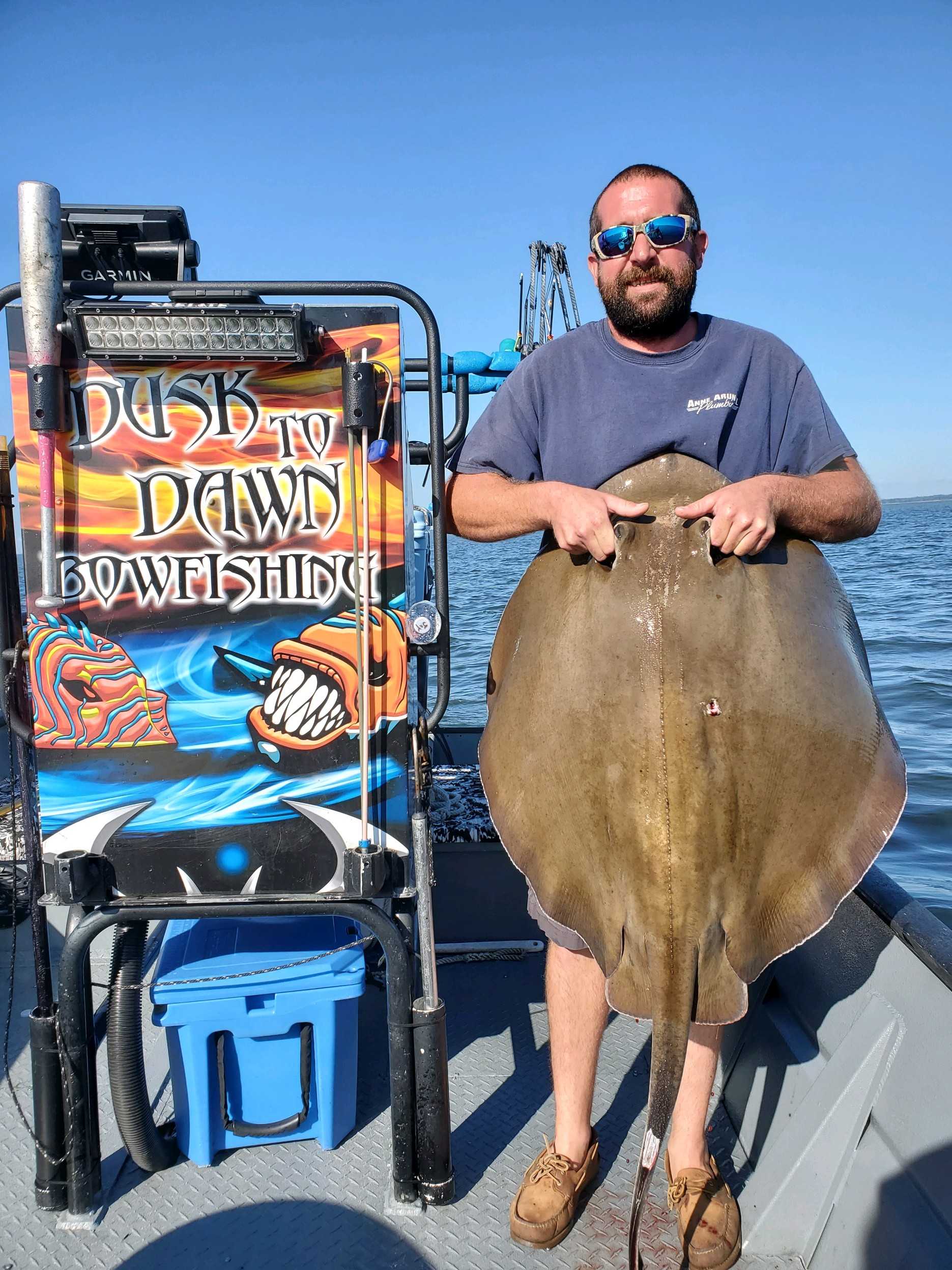 The bay has been pretty dirty lately, but today it cleaned up enough for Captain Marc Spagnola of Dusk to Dawn Bowfishing to put this shooter on a big southern ray.