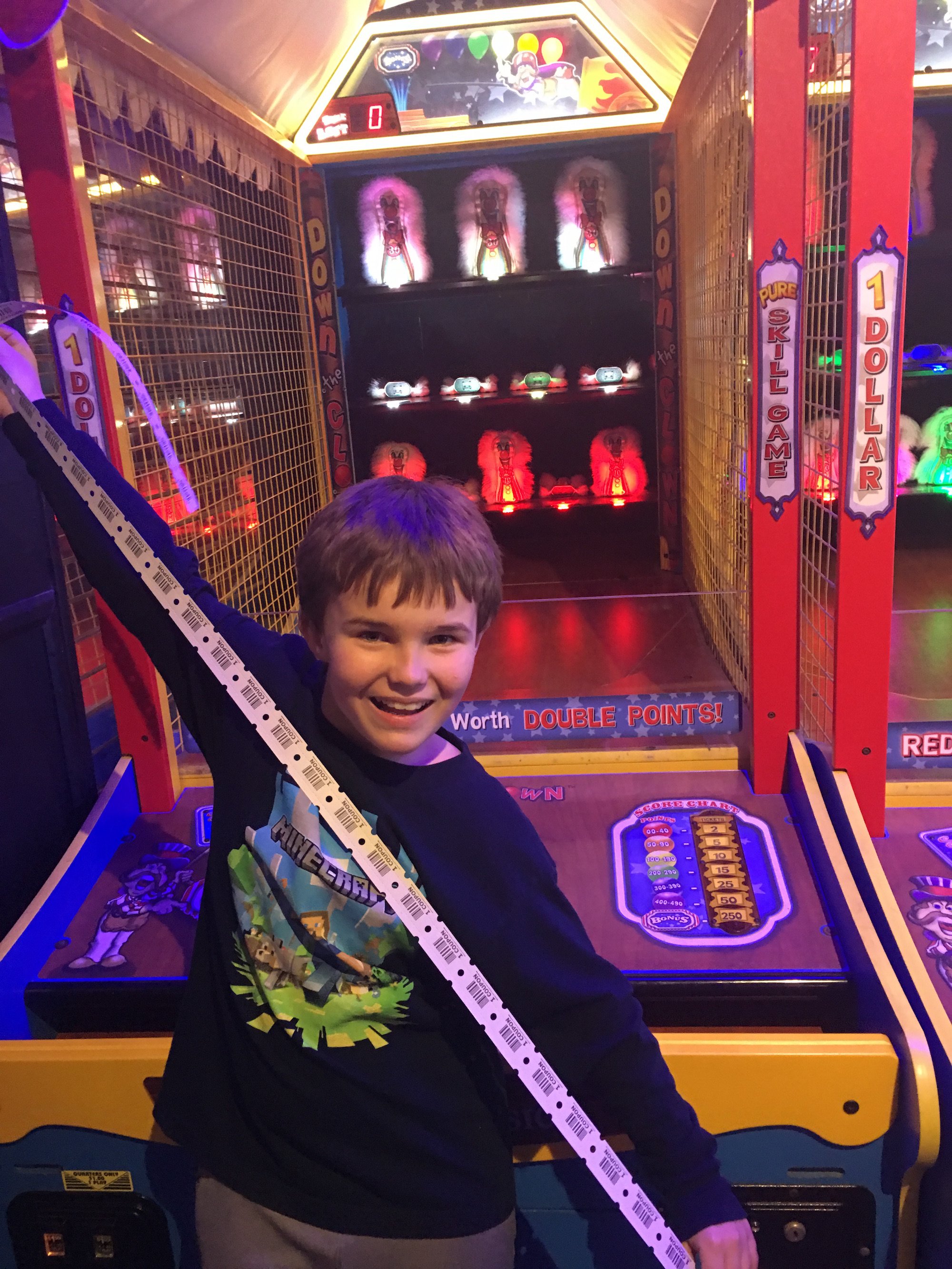 We bought a large bucket to share with lots of vinegar & salt then headed to the arcade where we played our usual skee ball, air hockey & our favorite game which involves hitting a clown with a ball…. which by the way results in a lot of tickets.