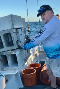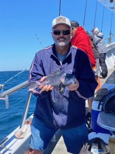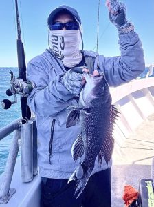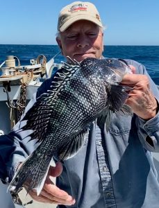 Sea bass will sometimes bite the bottom off a boat when it’s rough. Not today. Wasn’t a bust, not by a long shot – just had to work at em. Crazy Horse custom rods’ proprietor, David, boxed out – landed his 15 keepers. (Builds some sweet sticks – promise! I had a heavy sea bass rod built, but Courtney caught a bluefin on it and I haven’t seen it since!) Robert boated the largest/heaviest sea bass & Bob was our guest reef builder. My crew (one at a time and on my orders) jigged enough cbass to pay the rent and have some left to fry – even for me. A couple fellows didn’t seem to have medicated which resulted in an extremely low catch for them.